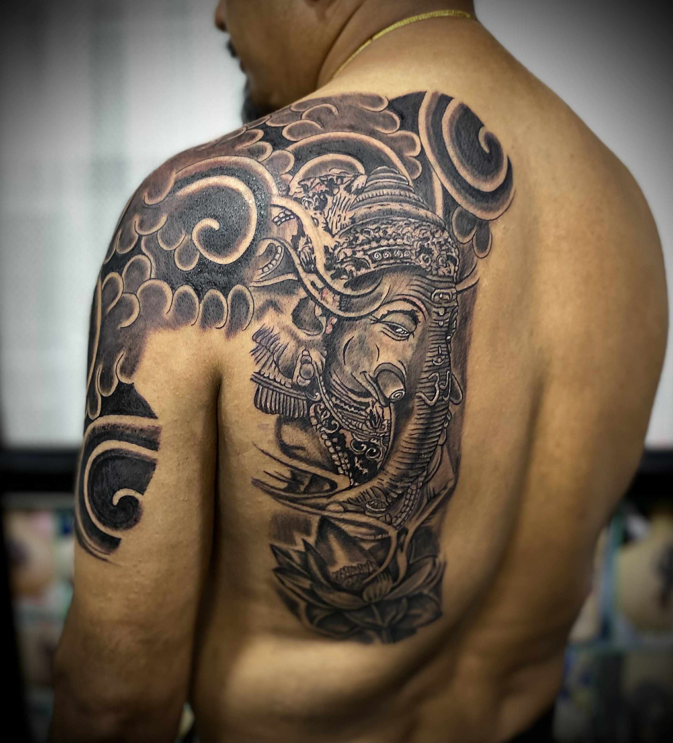 मेघ-कलाकृतिसहितको विस्तृत गणेश ट्याटु। -